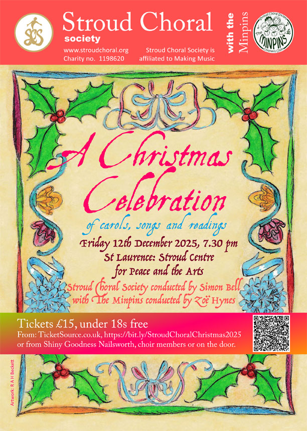 | Fri, 16 December 2022 St Laurence Parish Church, Stroud | Christmas Concert of Carols and Readings | Conductor: Simon Bell Accompanist: Jonathan Hope Children's Conductor: Zoë Hynes Accompanist: Nicola Jee | Adult Choir, Minpins Children's Choir | ![]() |
